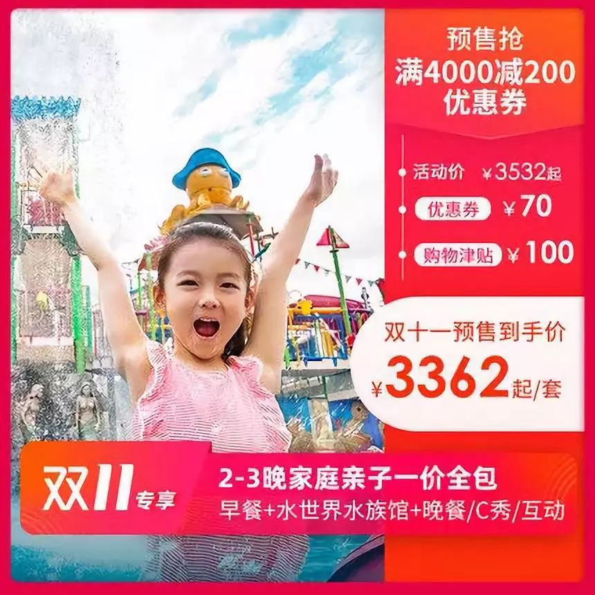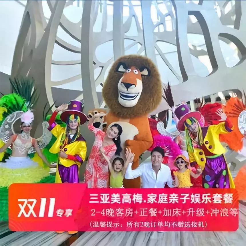 1599元2晚起含:2大2小早餐+正餐一次+儿童简餐1份+8小时看护+加床+冲浪或狮子玩偶+小火车或其他娱乐设施,提前预约还可以根据提前量来升级房型。剁手口令: