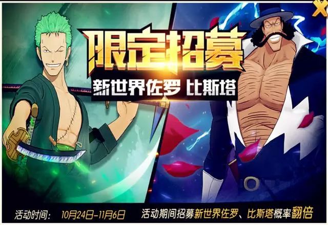 3、限时招募本次的限时招募就是新世界SSR索隆,咱们的草帽团终于有机会在主力舞台露面了,角色强度不错,关键是索隆人气高技能帅,因此会有很多玩家入手。不过需要注意一点,本次上线的索隆,和之前官方公布的有所出入,8星天赋有所削弱,原本是无视防御和减伤效果,现在被改成开局获得一道风墙,身后的队友获得减伤效果。