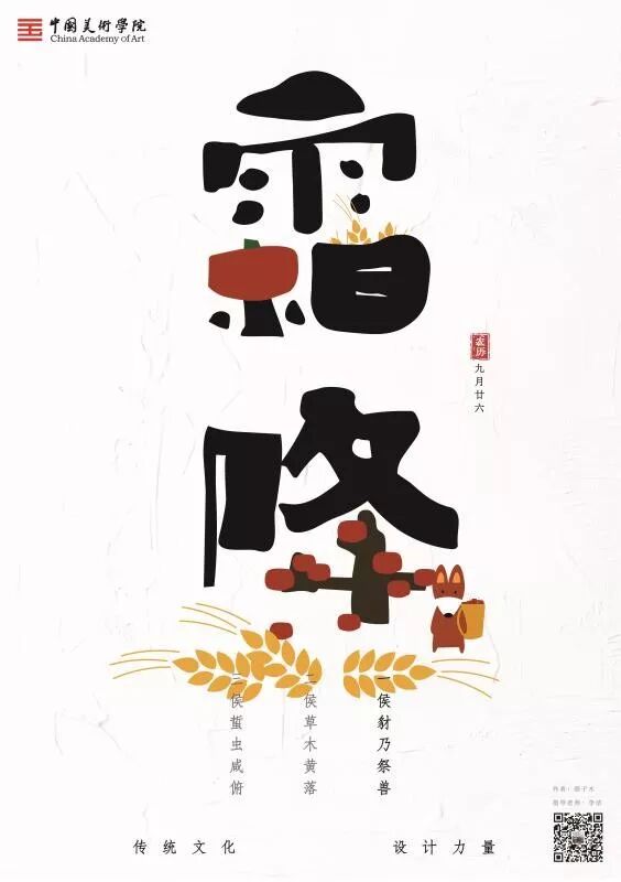 当古老的传统文化与极富创造性思维的设计相融合,会碰撞出怎样的火花?为响应新时代背景下对「中华优秀传统文化的传承工作」的号召,中国美术学院宣传部、学工部、研工部、设计艺术学院四方联合主办,推出「我们的节日」系列活动,以独特的视觉语言对中国传统二十四节气的视觉符号融合时代特点进行「再设计」。本次活动为大家带来了一组「霜降」系列海报。