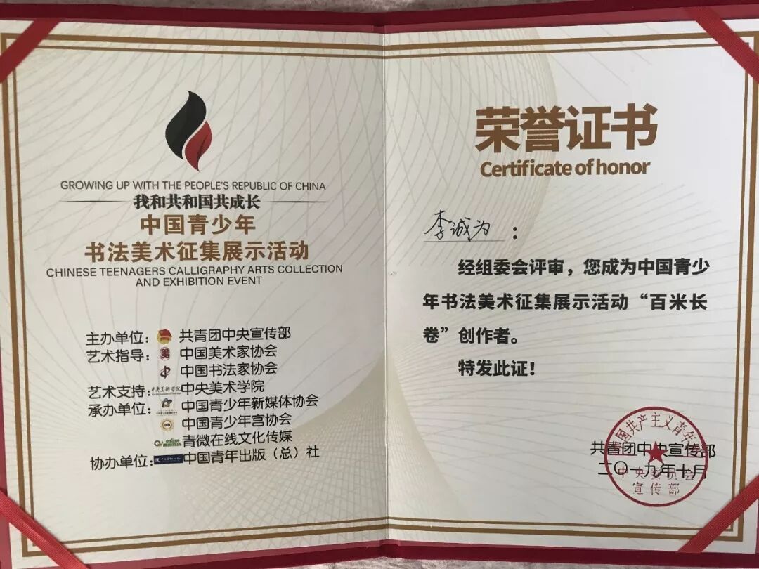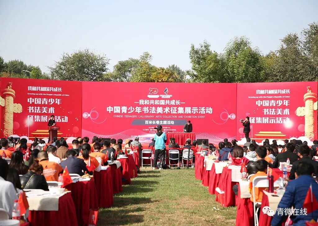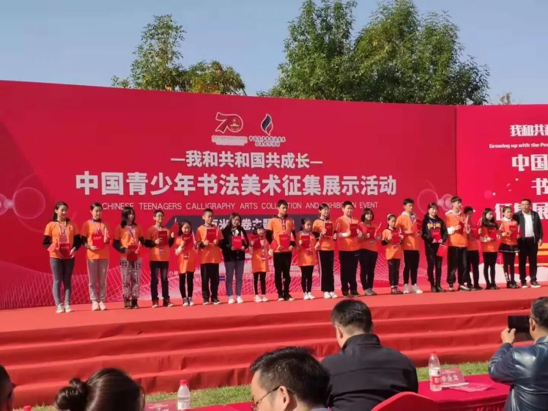 2019年10月20日上午,2019中国青少年书法美术征集展示活动之百米长卷主题创作在北京市少年宫举行。我校多名学生代表受邀参加本次活动。此次活动由共青团中央主办,中国美术家协会、中国书法家协会艺术指导、中央美术学院艺术支持,共青团中央宣传部副部长王良、团中央宣传部文化处处长吕通义、中国书法家协会行书委员会副主任、中国书协理事王学岭等众多领导专家到场,来自全国各地的140名青少年书法美术爱好者共同完成了“我和共和国共成长”的百米长卷,为祖国70周年献礼。