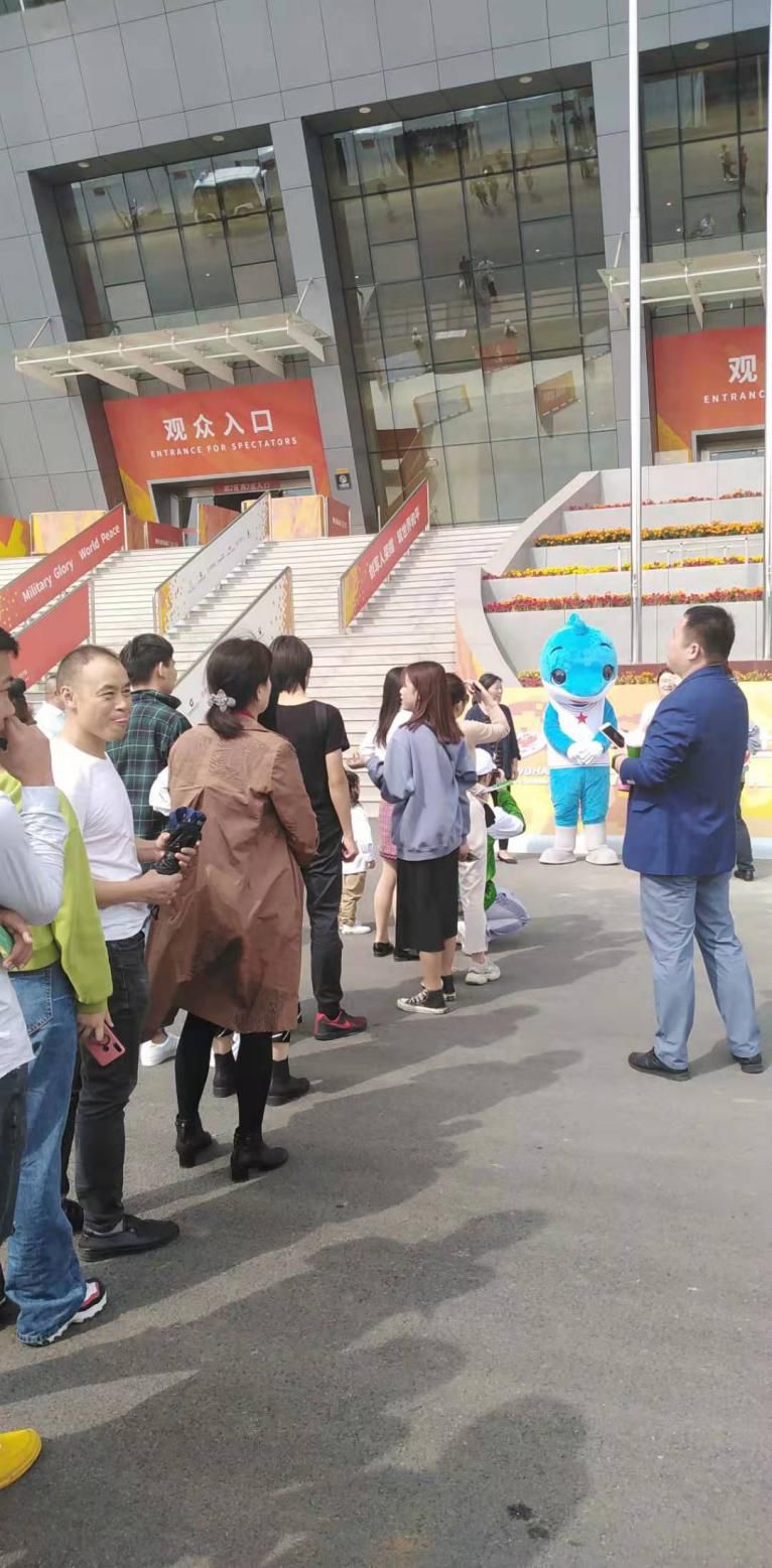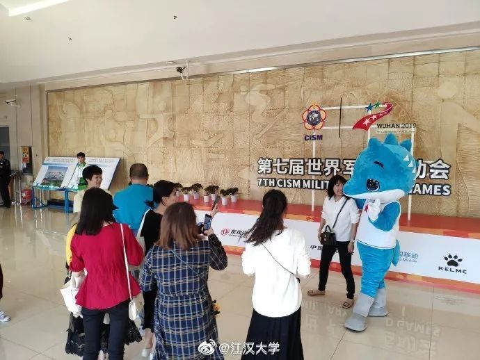 在江汉大学排球馆外,热情的观众们争相与萌态可掬的吉祥物“兵兵”合影,兵兵一会挥手、飞吻、耍宝。一会捂脸、捶背、剪刀手,有时候他还会牵着小朋友们的手做游戏,特别可爱。
