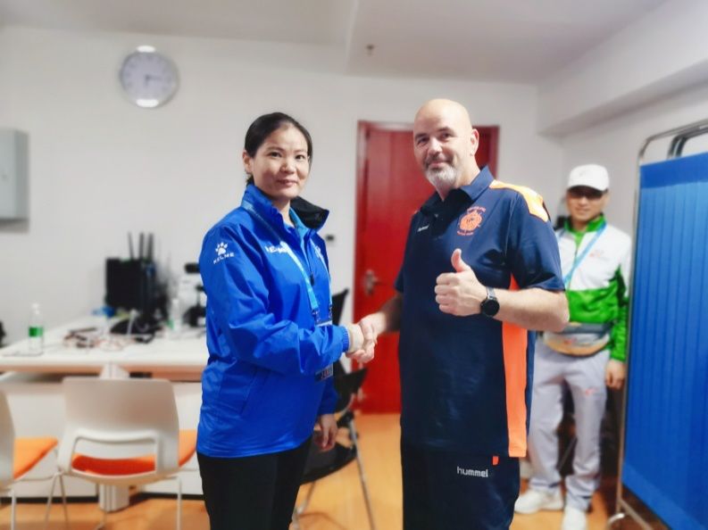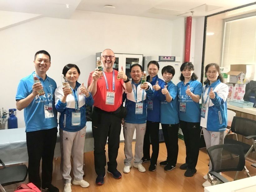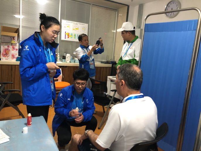 10月23日下午2点,一名卡塔尔运动员捂着肚子,表情痛苦的来到医疗点,经询问,该患者从当天早上起出现腹痛腹泻症状,无发热呕吐不适。查体后初步诊断为急性肠炎,需要转诊到定点医院治疗,遂向队医及教练告知病情,但因赛事需要,队医拒绝转运治疗。医疗组王松组长与队医进一步沟通后,临时给予 “蒙脱石散”口服以缓解腹泻症状,同时对其辅以中医穴位治疗。在随后的训练过程中,医护人员密切关注该队员情况,及时询问有无不适。比赛结束后,患者症状已明显缓解,与医疗组工作人员合影留念。