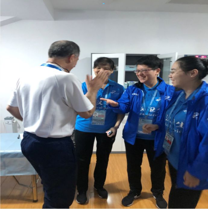 荷兰籍排球教练Broekemn Gerard因腰痛不适来医疗点寻求帮助,经医生仔细检查,诊断为“腰肌劳损急性发作”,给予对症处理,当日傍晚6点左右他再次来到医疗点,自诉症状已明显好转,并对医护人员的专业及热情非常满意。随后,他又介绍多名同行来医疗点就医。