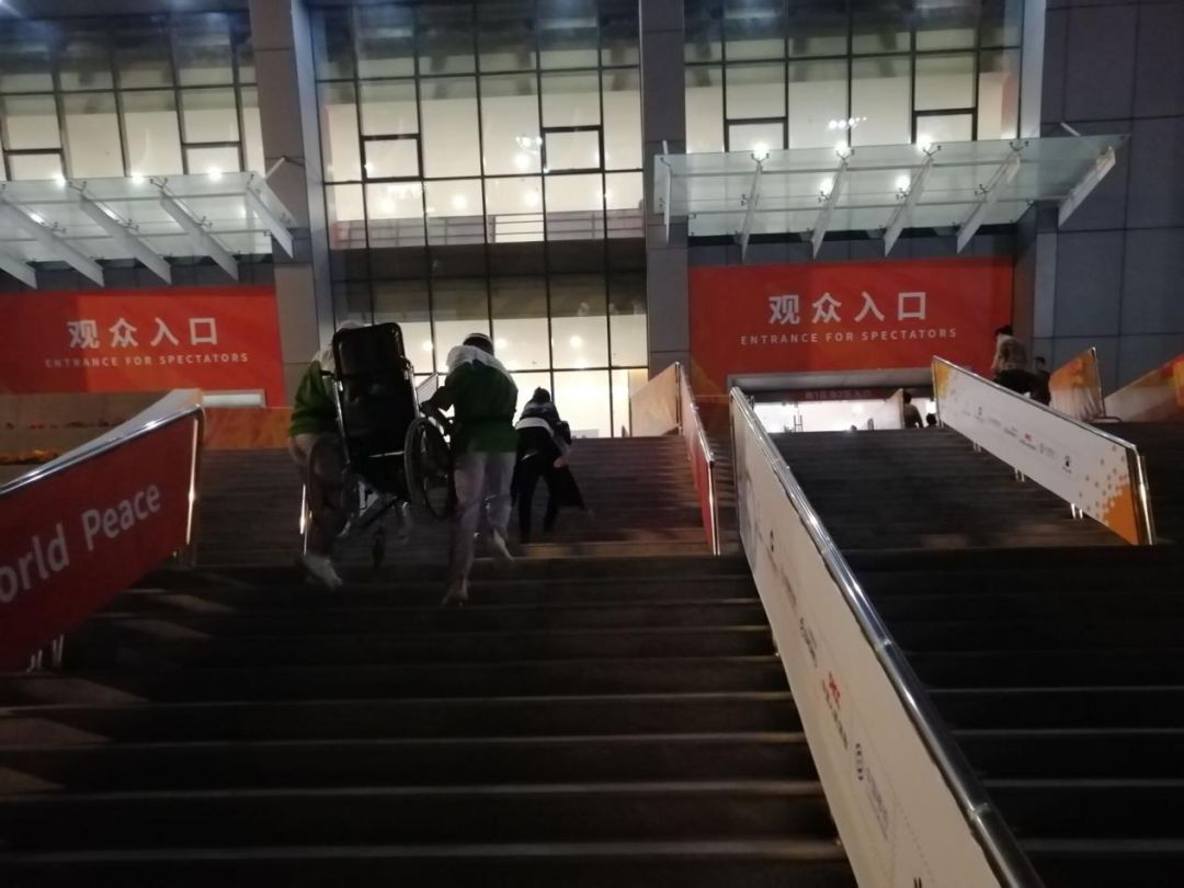 还有“Cover”全场的引导员们。停车场、售票亭、特许商品经营店......哪里有需要,哪里就有他们的身影:引导观众进场入座,维持场馆各区域秩序,帮助需要照顾的老人和儿童。22日中午,一位行动不便的老年观众突感身体不适,志愿者拿来事先准备好的轮椅,送老人回到儿女身边,当遇到下坡时,志愿者还细心的将将轮椅反转,防止老人从轮椅上跌落。