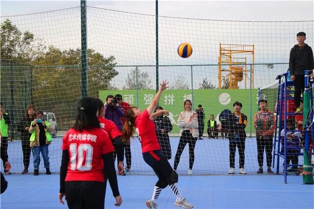 女排选手们实力难分高下,比赛过程扣人心弦,突然,一个回扣使得局面扭转,两队的比分逐渐持平,女排精神在她们身上得以体现,场外的啦啦队成员们高声呐喊,为自己院系的队员加油鼓劲,呐喊声回响在整个排球场的上空,久久没有散去。