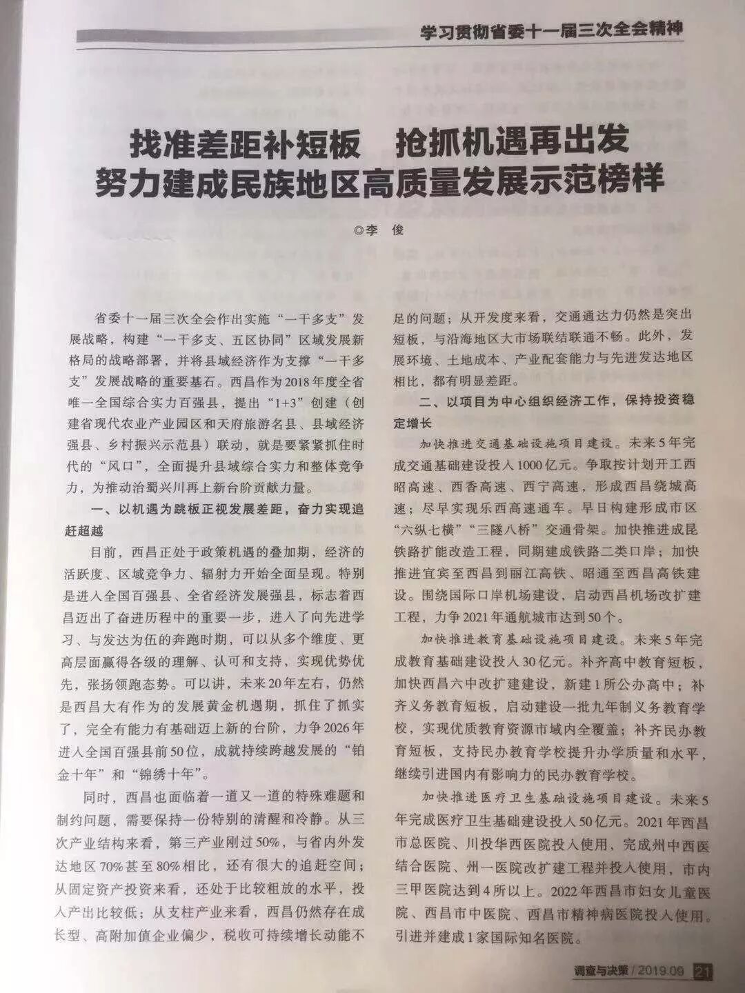 由中共四川省委全面深化改革委员会办公室、中共四川省委政策研究室主办的《调查与决策》2019年第9期刊发西昌市委书记李俊署名文章——《找准差距补短板抢抓机遇再出发努力建成民族地区高质量发展示范榜样》。