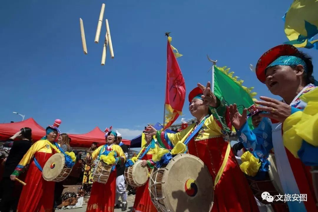游客欣赏朝鲜族原生态民俗歌舞,参加民俗娱乐活动的场景