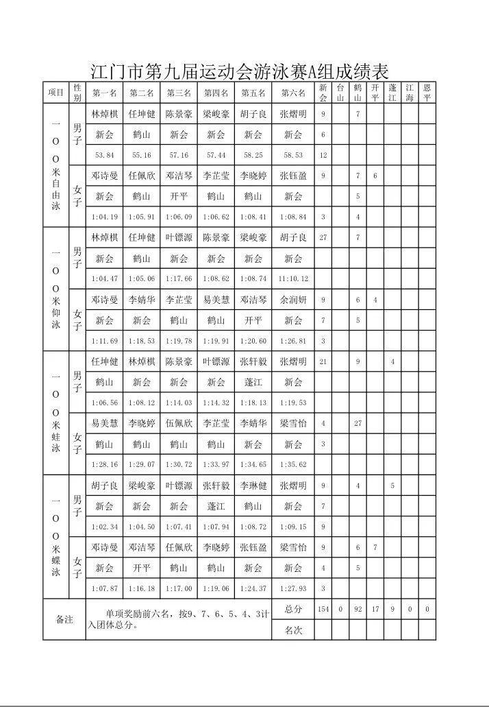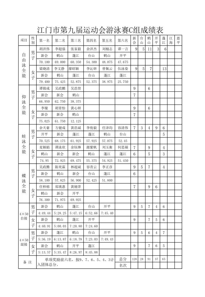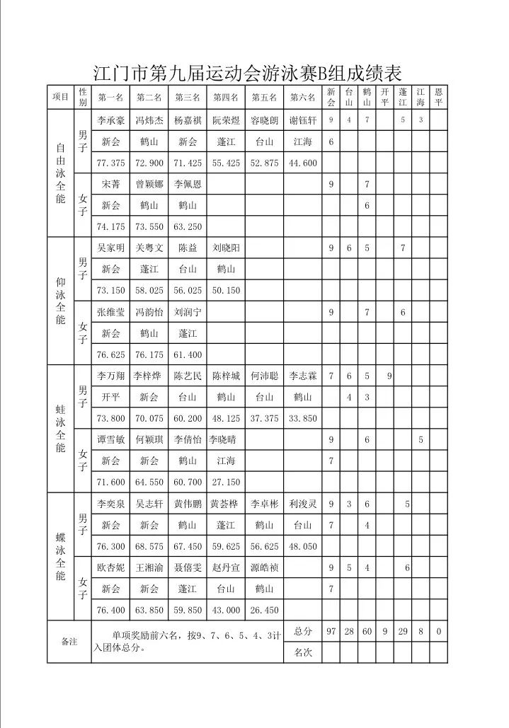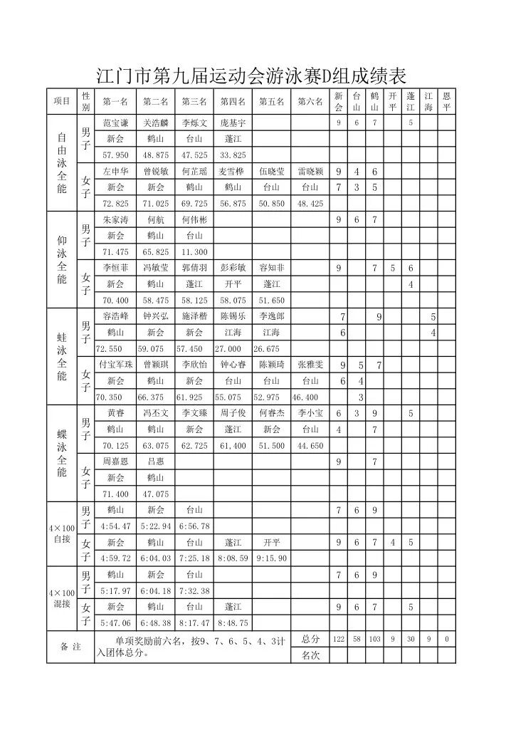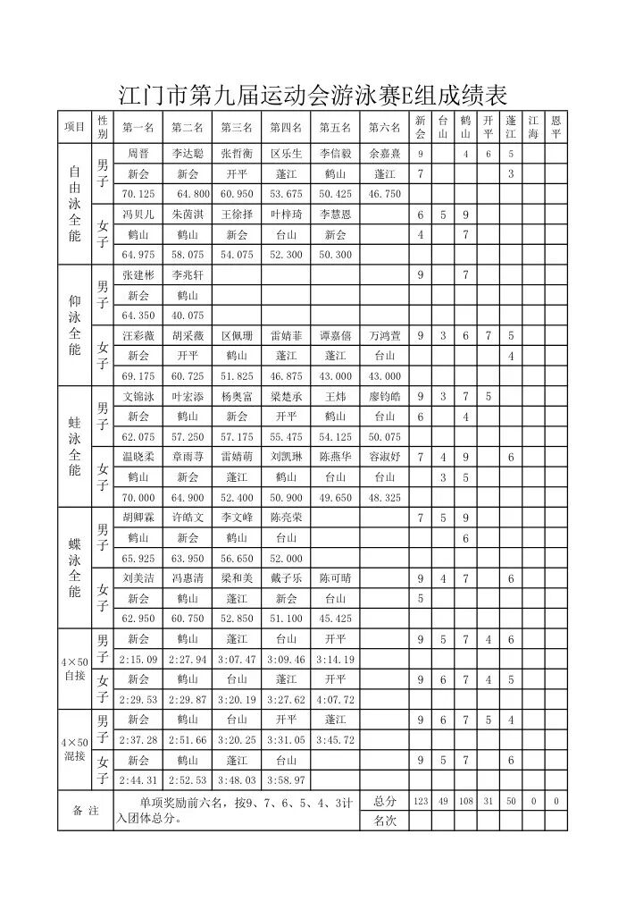 10月21-23日,由江门市人民政府主办,江门文化广电旅游体育局承办,江门市青少年体育联合会协办,广东体汇体育传媒有限公司运营的江门市第九届运动会“康师傅杯”游泳比赛在江门体育中心-游泳馆展开激烈比拼。经过3天激烈比拼,最终新会取得团队第一,鹤山第二,蓬江第三,台山第四,开平第五,江海第六。