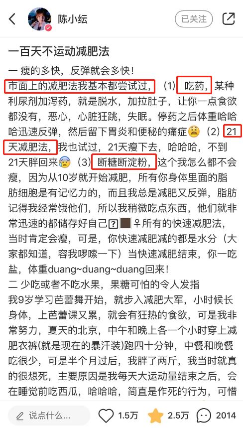 作为女明星,自律可是圈粉利器。陈小纭就曾经在微博发布100天不运动减肥法。可惜,结果并不理想。