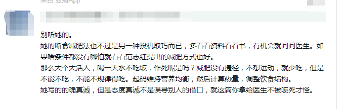 的确,这种不要命的减肥方法,并不适合所有人。作为公众人物,她这样分享出来,会对大众造成误导。