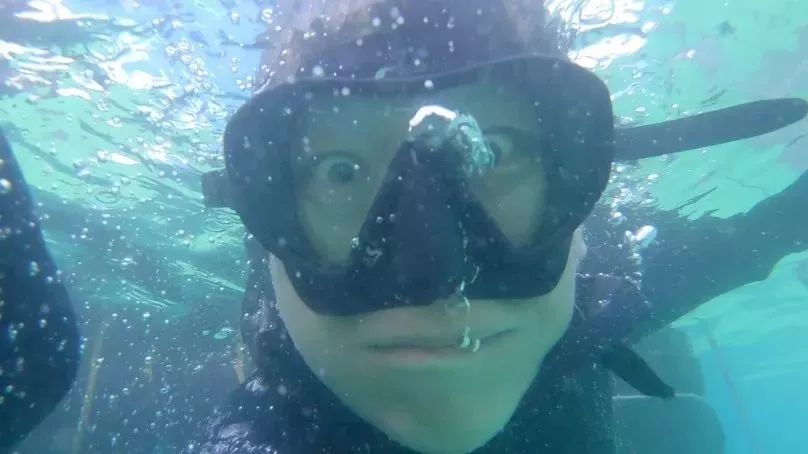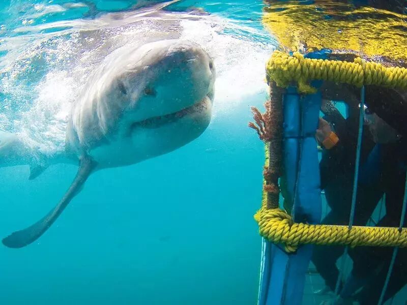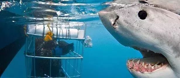 穿上潜水装备,钻进坚固的铁笼中,工作人员将充满鱼腥味的诱饵抛洒入海水中,就可以看到张着血盆大口的鲨鱼在身边穿梭了。