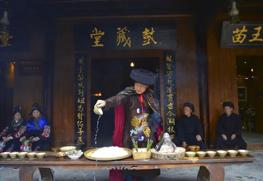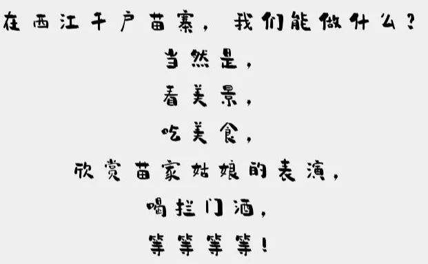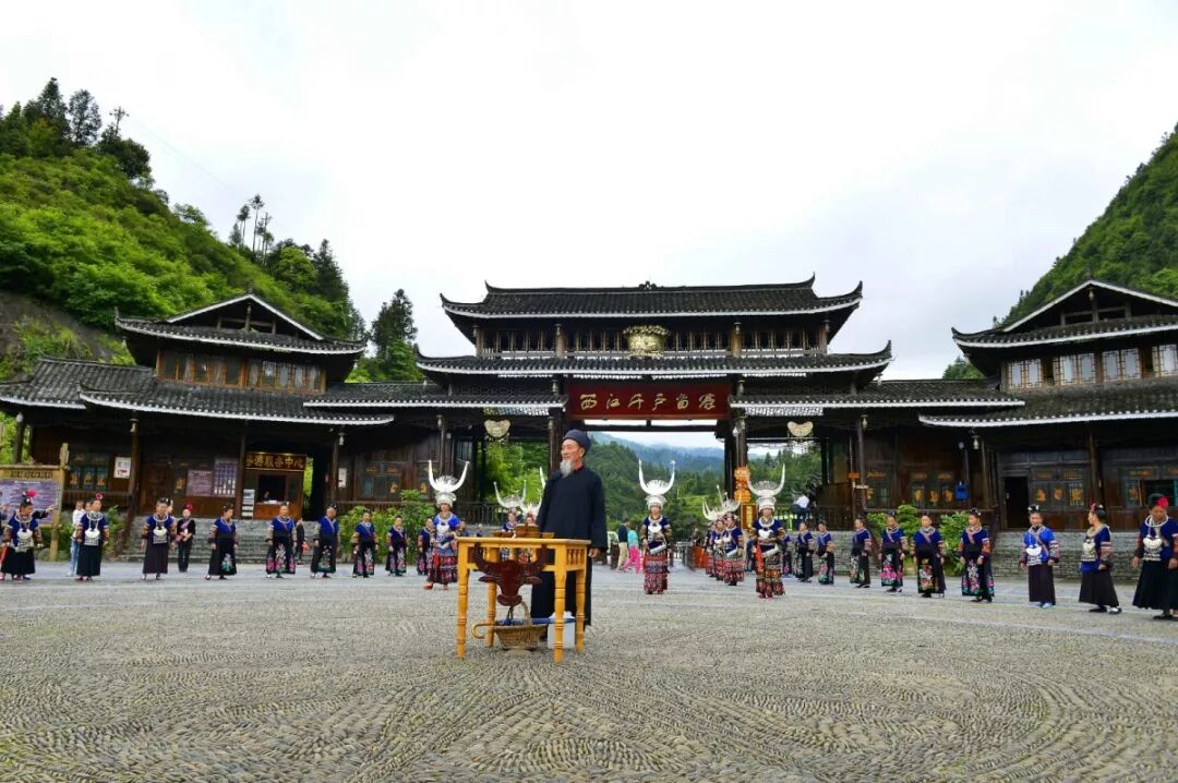 当你来到西江千户苗寨景区的北门,就会看见苗寨人穿着盛装,摆着十二张大方桌,苗家姑娘端上米酒,同时请来村寨德高望重的寨老来敬酒,这是苗家迎接宾客的最高礼——十二道拦门酒。这十二道酒分别代表了十二道祝福与祈愿:一道恭喜; 一道昌盛;三道勤劳;四道善良;五道宽宏;六道富裕;七道明亮;八道美丽;九道长寿;十道英雄;十一道智慧;十二道华贵。