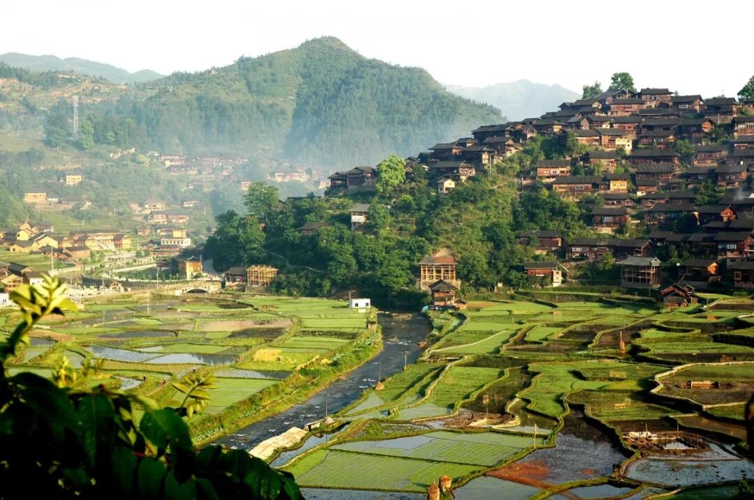 层层的梯田,清澈的河水,还有水田间弯弯曲曲的小路,有时候你还能看见一家人在水田里忙碌,平整土地,插秧,田园风光,让人感受到浓浓的淳朴民风。远处黛墨色的高高低低的群山环抱着小村庄,依着山势修建的吊脚楼,黛墨色的群山、黄色的梯田、黑色的人字行房顶、白色炊烟组成一幅美丽的自然画卷。
