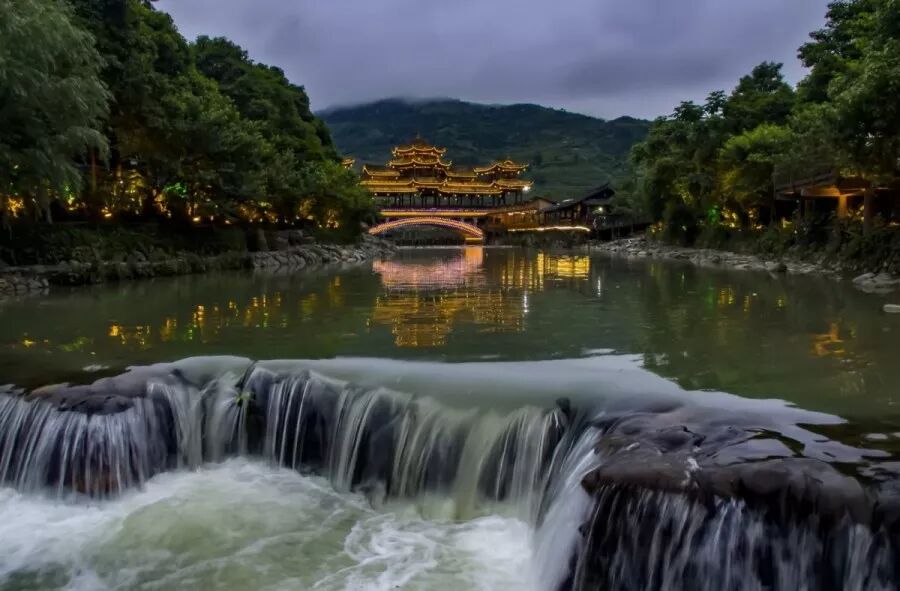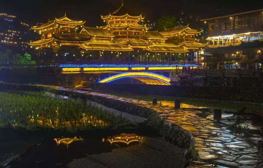 除了吊脚楼,风雨桥也是西江千户苗寨很有特色的建筑。风雨桥也称花桥,流行于湖南、贵州、广西、湖北等地,多建于交通要道的河流上,通常由桥、塔、亭组成,用木料筑成,因行人过往能避风雨,因此得名。初进入苗寨,随处可见木制的古桥,白水河把这头的山和那头的山分开,于是,架在这白水河上的桥便成了连通两头最紧密的要道。既起到方便寨民过河的作用,也是古寨的一道亮丽的风景线。