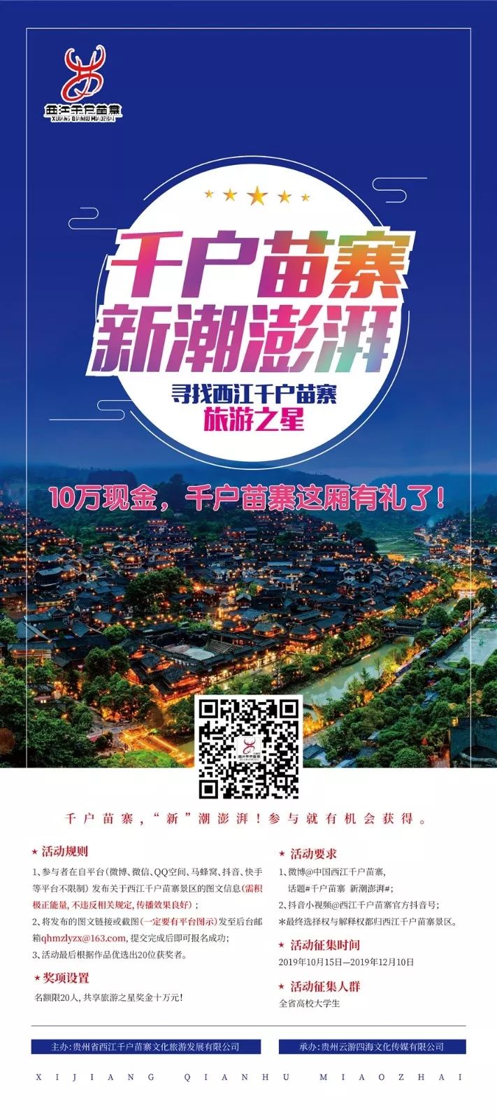 不管微博、微信、QQ空间、抖音、快手、马蜂窝等哪一个平台,不管你是拍出什么风格的照片,只要你敢show!你就是我们要寻找的西江千户苗寨旅游之星!共享旅游之星奖金十万元!
