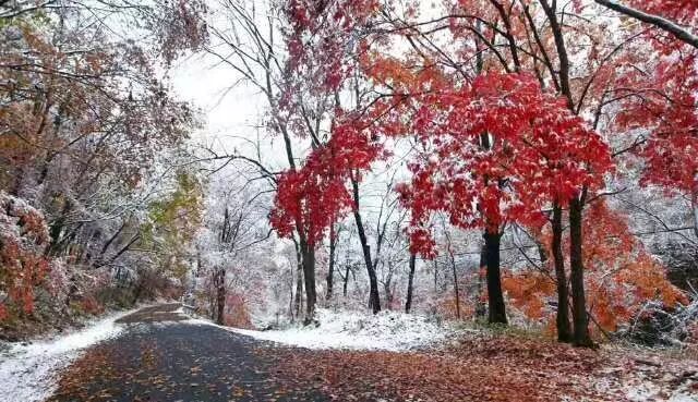 雪沃山岭千般秀,玉润红叶媚娇颜。