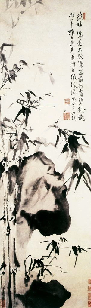 写山石之后,数竿新竹在风中枝叶飘摇。浓淡墨色、疾笔劲力将竹子受风飞舞之态刻画出来,清韵满纸。