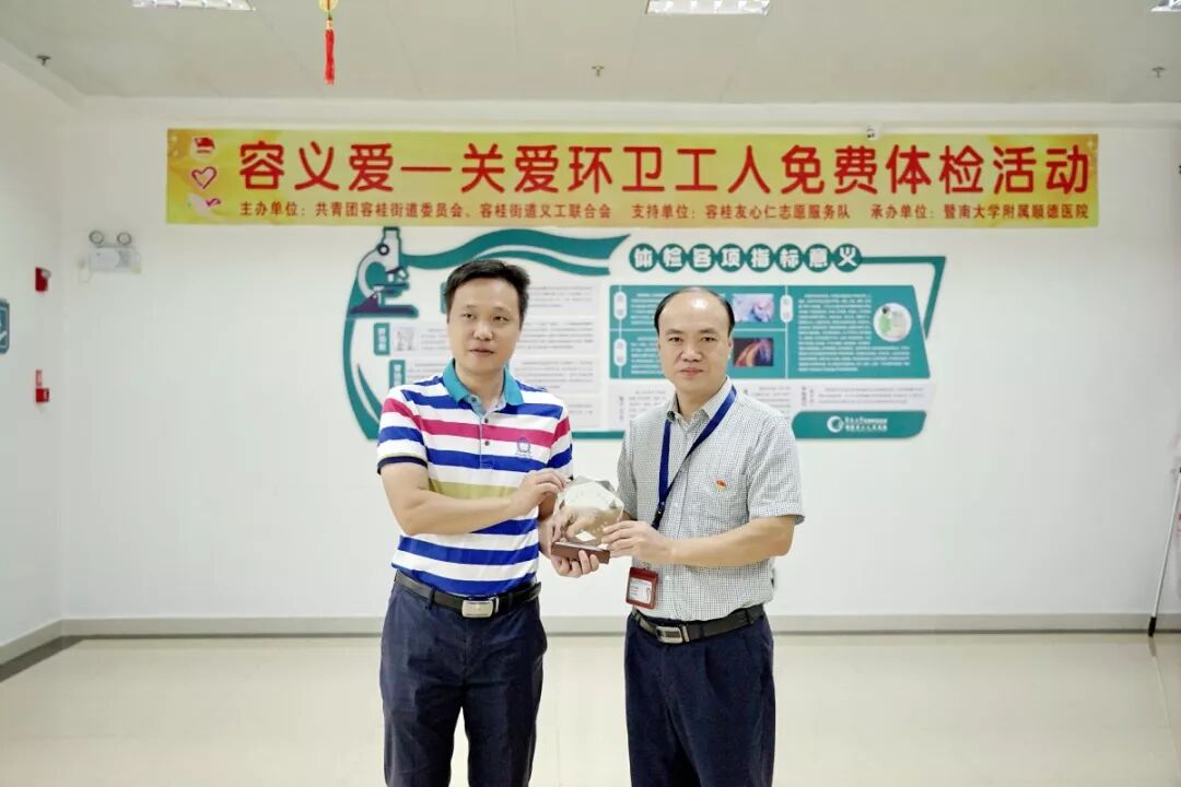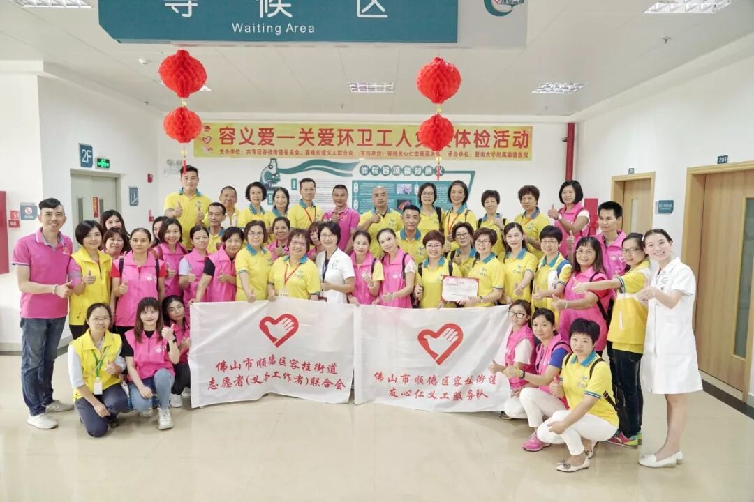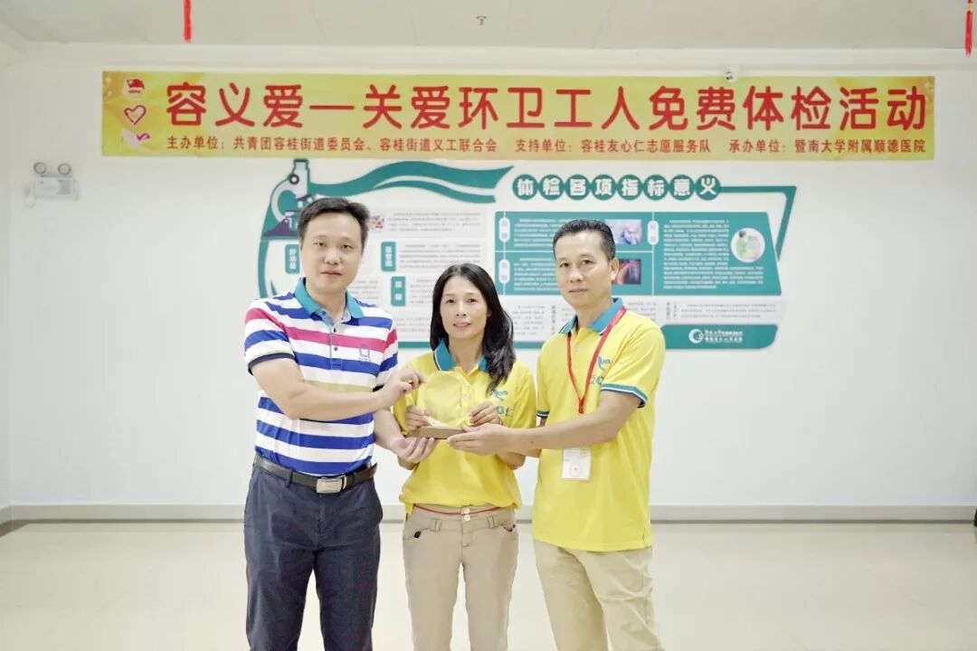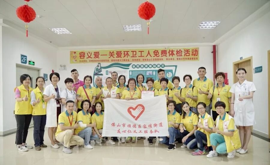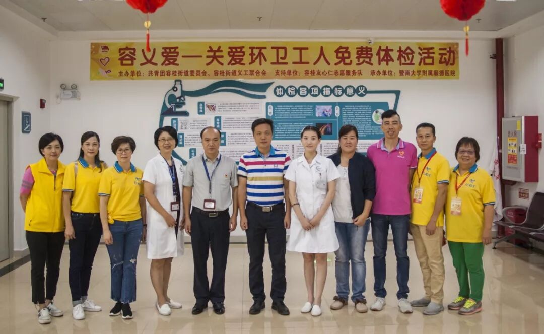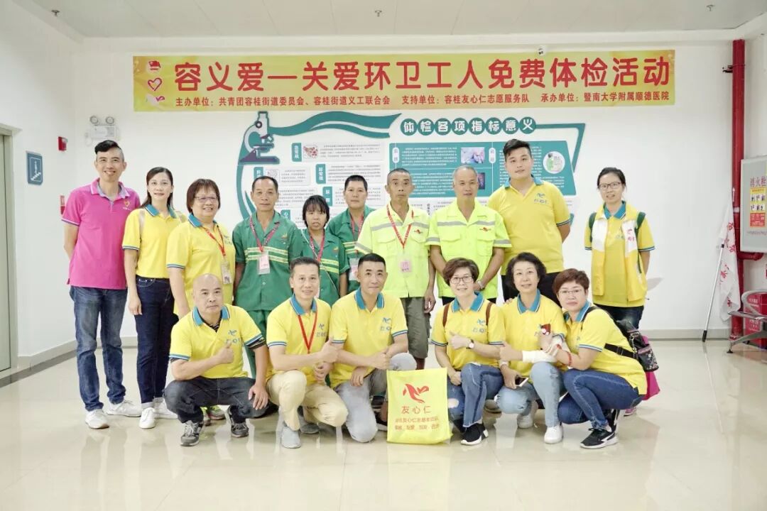 藉着广东省第26个环卫工人节(10月26日)即将来临之际,由容桂团委、容桂义工联联合主办,社会热心公益的“友心仁”义工服务队支持,暨南大学附属顺德医院(顺德区第二人民医院)承办的“容义爱——关爱环卫工人”免费体检服务活动在10月18日举行。