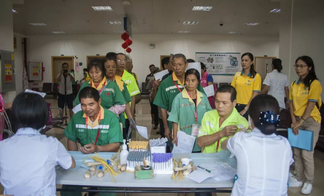 当日早上,活动为来自容桂环卫分局各社区辖下公司的100名50周岁及以上的一线环卫工人进行了免费体检服务。体检地点设在暨南大学附属顺德医院的体检中心,体检项目主要有:肝功能、血脂、肾功能、胸部透视、血糖、血常规(五分类)、尿常