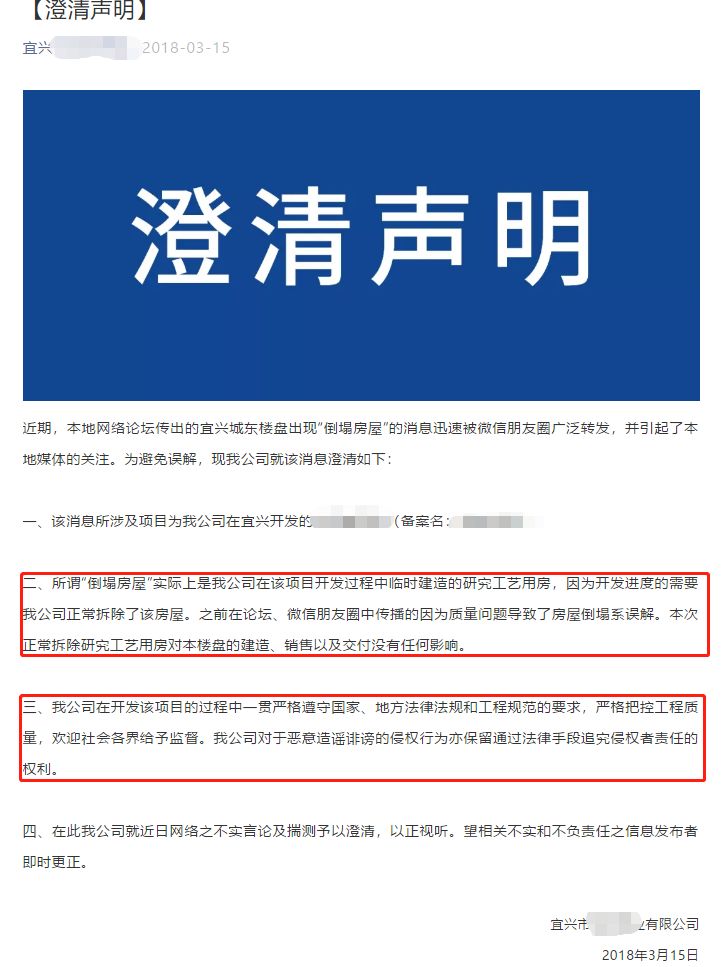“我公司在开发该项目的过程中一贯严格遵守国家、地方法律法规和工程规范的要求,严格把控工程质量,欢迎社会各界给予监督。我公司对于恶意造谣诽谤的侵权行为亦保留通过法律手段追究侵权者责任的权利。”