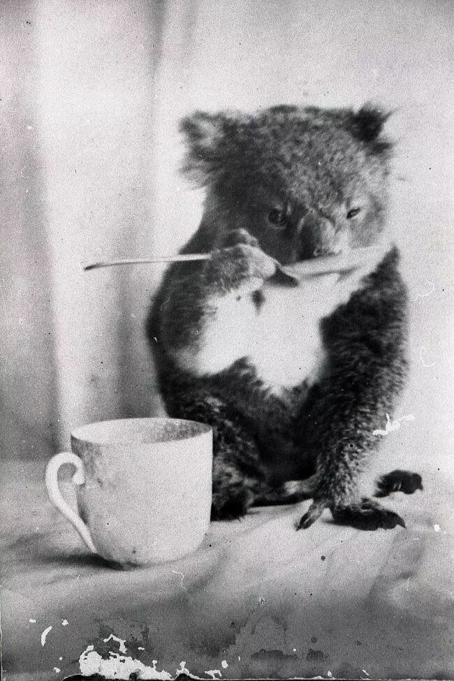1. 1900年澳洲,一只被人类当做宠物的无尾熊用汤匙喝茶。