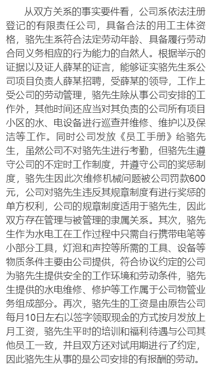 2014年5月1日,公司招聘骆先生为公司的水电工,从事水电设备维修和维护等工作,双方签订了《兼职水电工劳务协议书》,协议约定:“1、协议有效期2014年5月1日至2016年4月30日,其中试用期为前2个月。...4、甲乙双方因工作需要随时(包括夜间)电话通知乙方前来工作。5、乙方实行不定时工作制,不受甲方考勤限制。...8、若乙方因工伤残,由甲方负责工资、医疗等全部费用。”骆先生在公司上班期间没有购买社会保险,骆先生工作时自行携带电笔等小部分工具,灯泡和声控等所需的材料到公司办公室领取,工作期间公司不考勤。2015年4月8日,骆先生在修理通行杆时受伤,后骆先生到人民医院进行治疗。2015年7月8日,骆先生向仲裁委提出申请,请求确认骆先生与公司存在劳动关系,仲裁委裁决骆先生与公司从2014年5月至今的劳动关系成立。公司不服,向一审法院提起诉讼,要求确认双方之间不存在劳动关系。