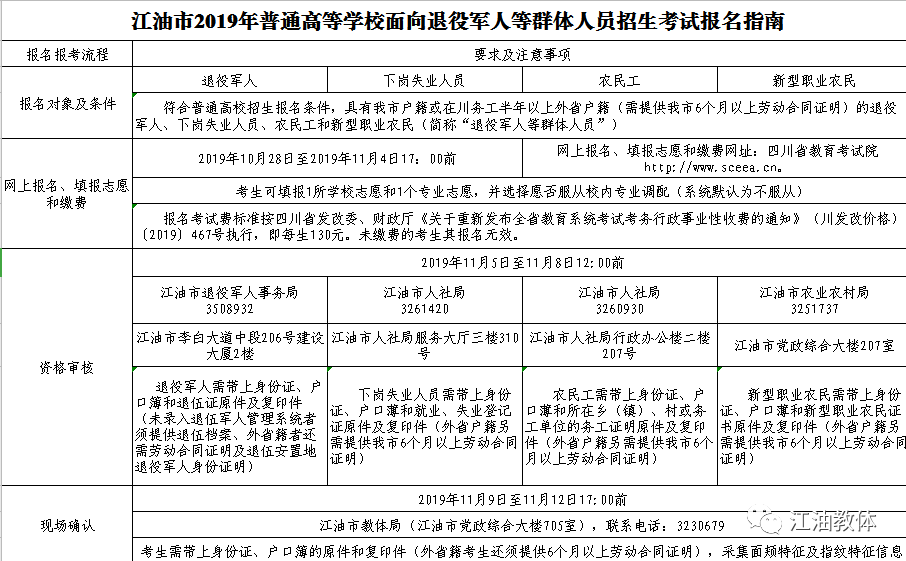 附:江油市2019年普通高等学校面向退役军人等群体人员招生考试报名指南