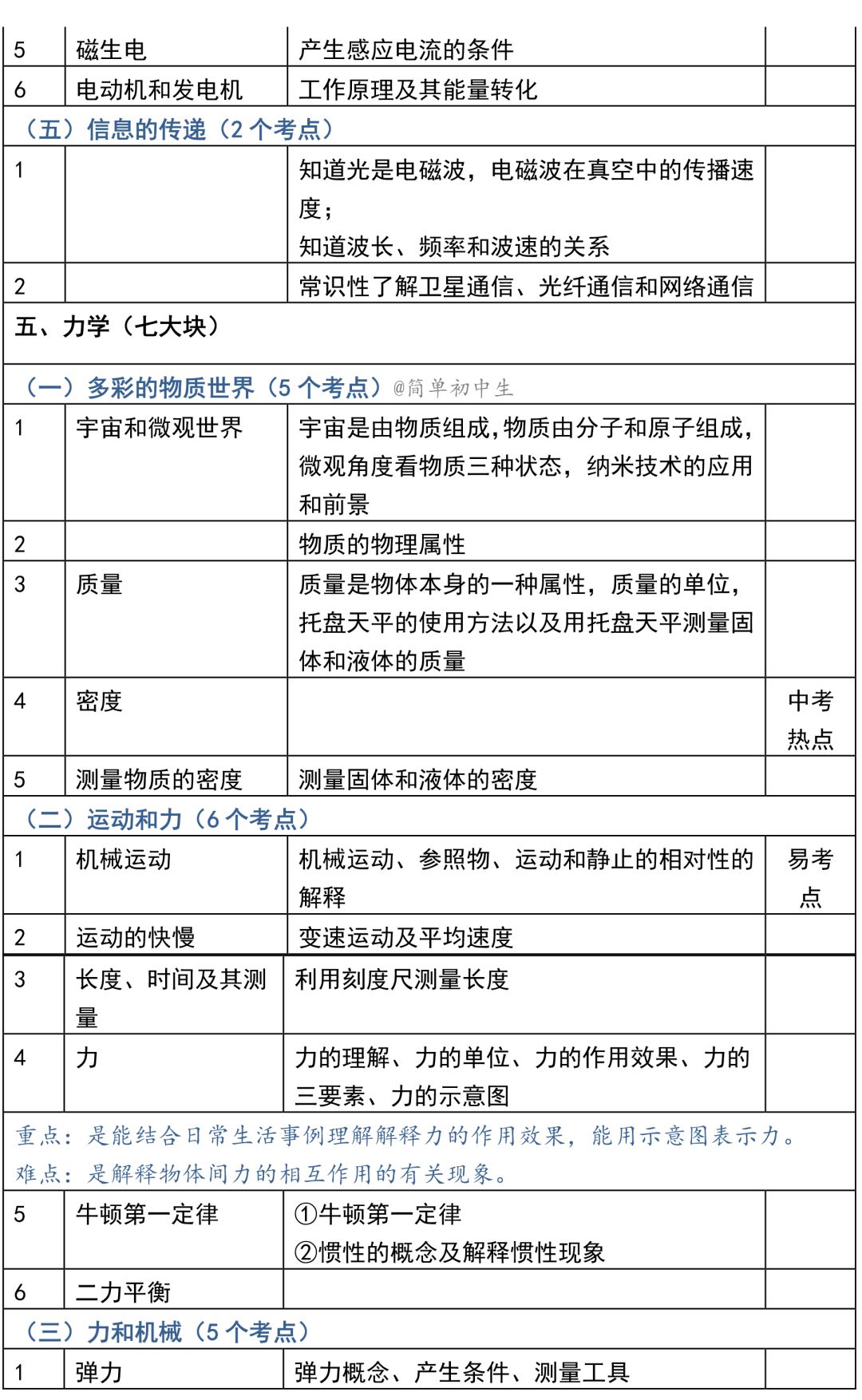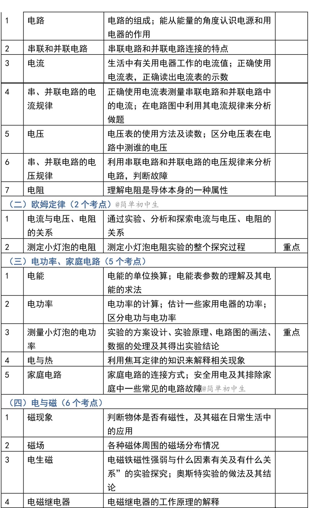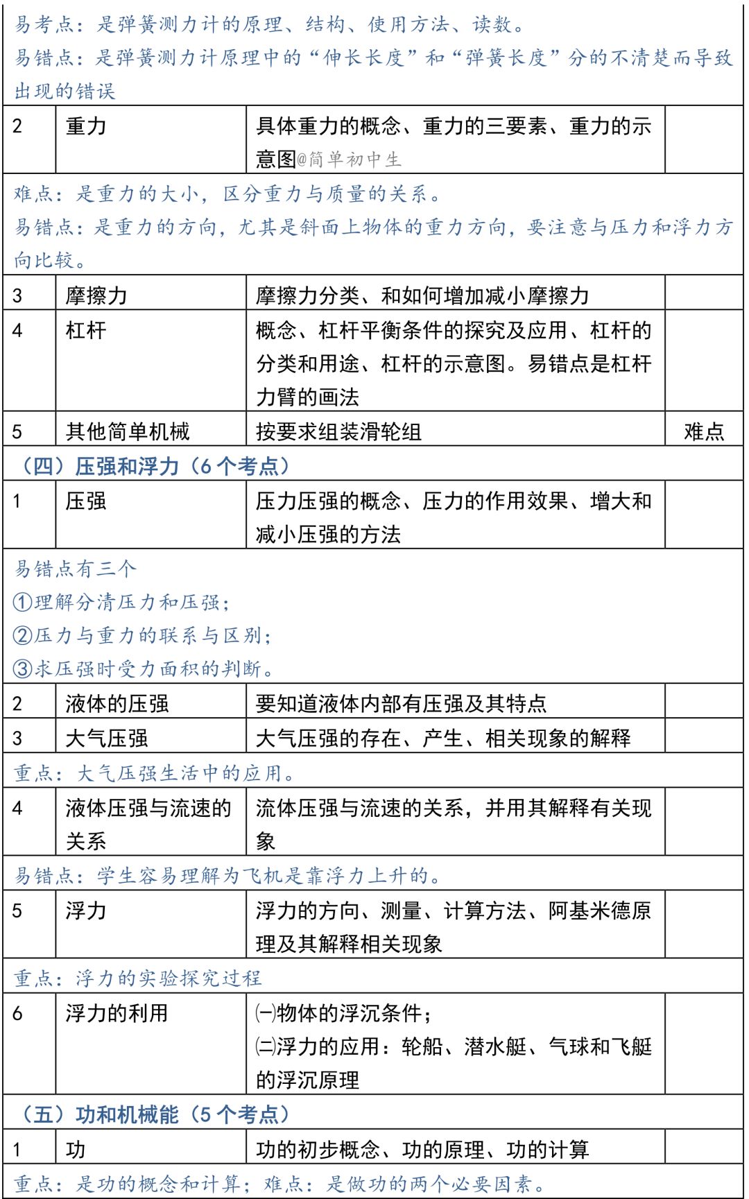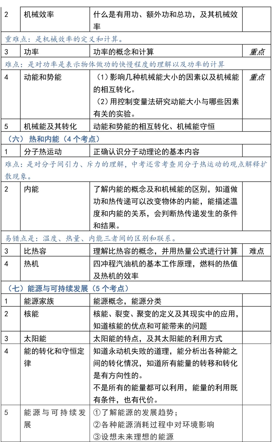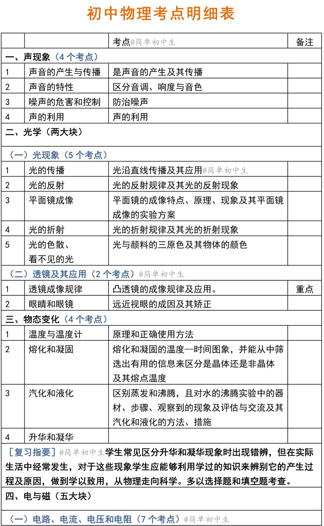 初中物理考试各章考点明细表,中考复习必备,建议初二初三人手一份