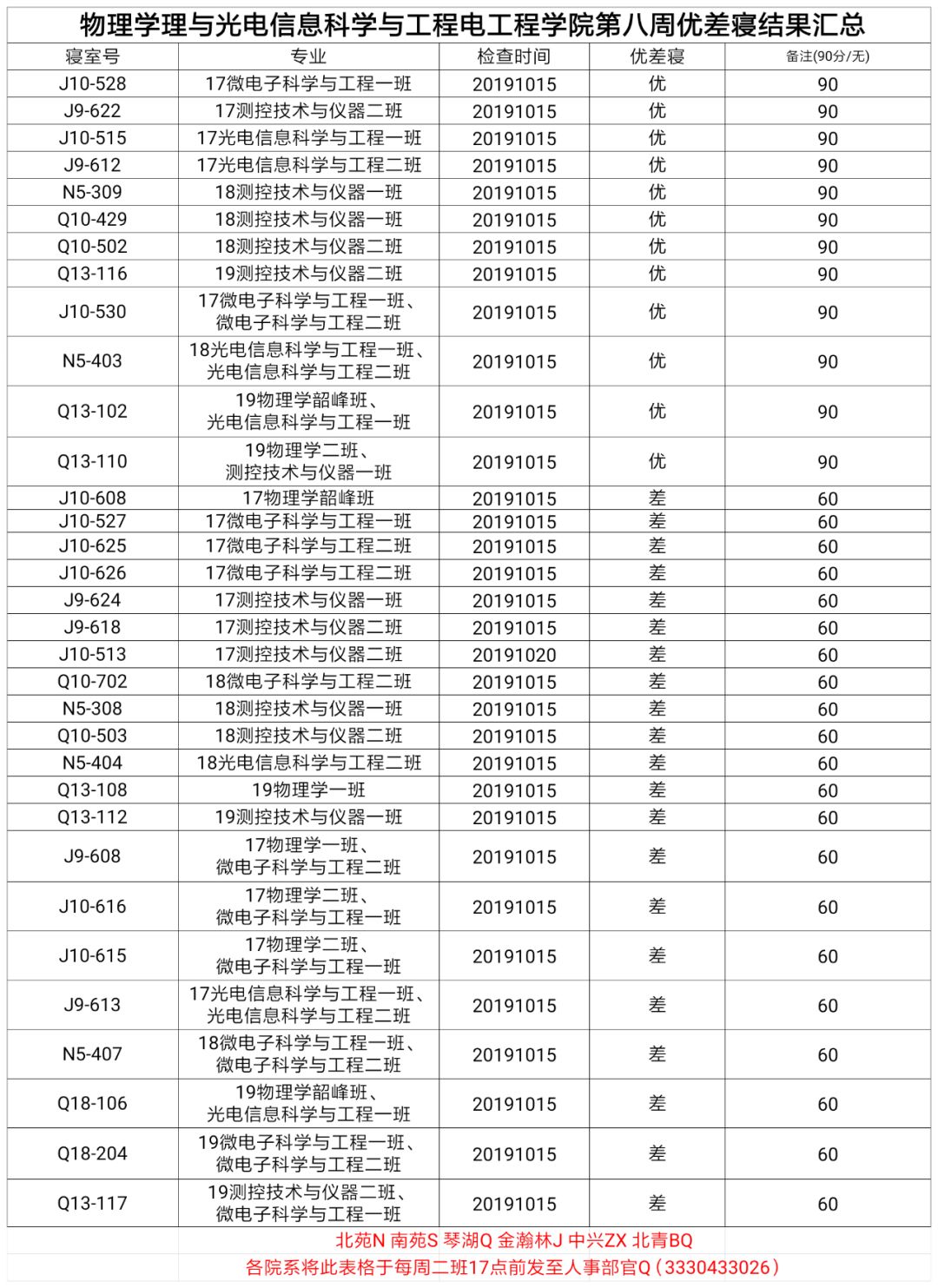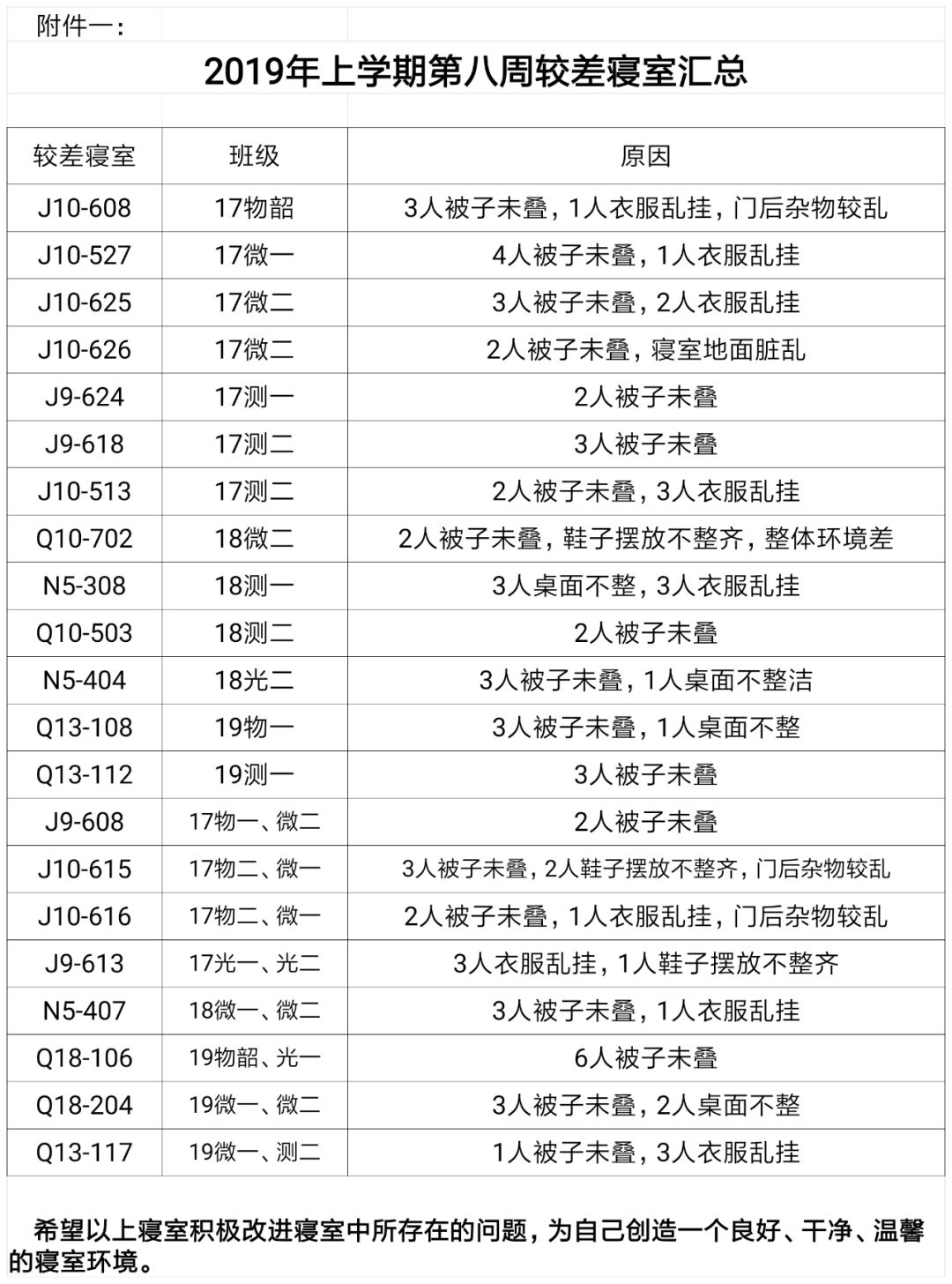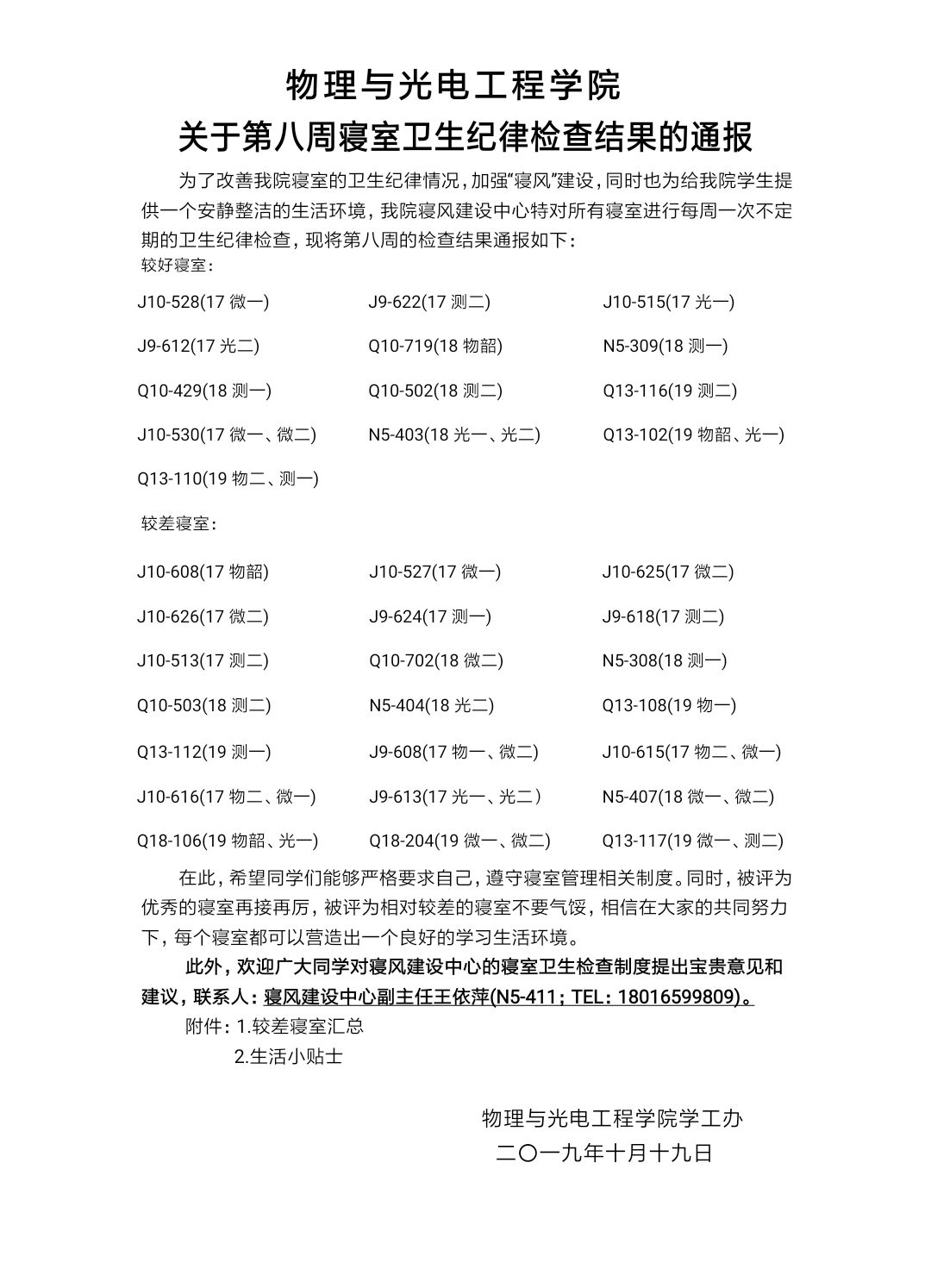寝风通报| 物理与光电工程学院 关于第八周寝室卫生纪律检查结果的通报