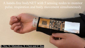 鲍哲南教授领导的研究团队研制了一套监测健康状况的传感器系统。这个系统分为两个部分:一部分是可贴在皮肤上的传感器贴片,用于收集人体的脉搏、呼吸、运动等诸多生理信号;另一部分是缝制在衣服中的柔性信号阅读器,采用无需电池的非传统射频识别技术,读取皮肤上传感器贴片传输出来的生理信号,并通过蓝牙将这些信号传输到手机app上。他们将这些传感系统贴在志愿者的手腕、肩膀、胸口等部位,构成“身体网”(BodyNet),在不影响他们正常活动的情况下监测脉搏、肢体运动、呼吸等信号,信息传输到app上,使得健康监测不再依赖医院里笨重复杂的监测系统。【9】