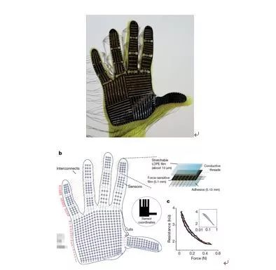 借助柔性压力传感器,还可以实现对物体形状的感知。我们的皮肤各处分散着压力感受器,但只有接触到物体的感受器才会给我们大脑发送信号。麻省理工学院的科研人员设计出了一种低成本的可伸缩触觉手套,上面分布着548个压阻型压力传感器,每个传感器可感知到的压力数值都能被详细记录下来。他们利用这个手套抓握了杯子、勺子、笔、石头等物体,记录手套抓握的数据,并录制视频。然后利用这些数据训练深度学习网络,从而鉴定出不同的物体。【2】