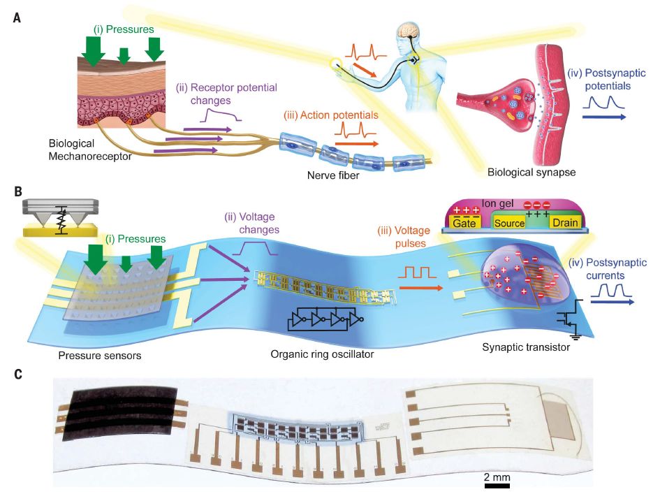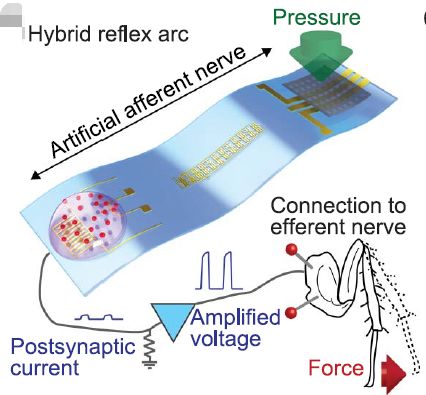 针对这个问题,科学家们发明了人造传入神经。这种人造传入神经有三个核心成分:压阻型压力传感器、有机环形震荡器和突触晶体管。压力传感器负责获取压力信息。环形振荡器代替神经纤维,将压力信号转化为与感觉神经元动作电位的频率相匹配的电压脉冲。突触晶体管将这些脉冲信号整合并转化为突触后电流,并与生物体内的传出神经对接,形成一个完整的单突触反射弧。