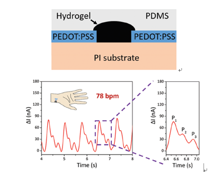 中国科学院深圳先进技术研究院鲁艺研究员团队合成了一种新型超柔软导电聚合物,这种聚合物对微小的形变非常敏感。以该聚合物为材料制作柔性压力传感器,将传感器放置在手腕上,不仅成功采集了桡动脉脉搏信号,还能清晰分辨每个脉搏波形的特征峰。这些高精度的波形信号可进一步用于心血管疾病的诊断和监测。【10】
