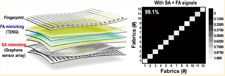 来自韩国的团队仿造皮肤的这一结构,制造出了一种触觉传感器。他们用柔性压力传感器模仿慢适应传感器来感知压力大小和分布,用摩擦纳米发电机技术来模仿快适应感受器,配合触觉传感器表面的仿指纹结构。随后,他们借助深度学习技术,将触觉传感器在12种纺织品表面来回扫描,获得的数据用来训练神经网络。最终,触觉传感器能够分辨这些织物的材质,准确率高达99.1%。【3】