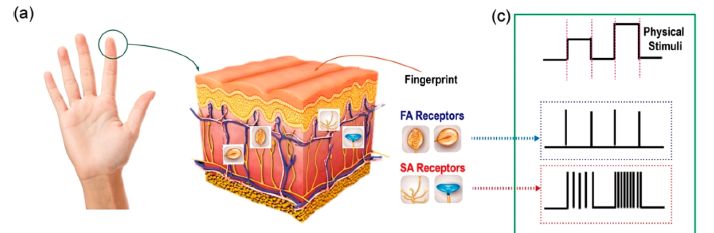 神经系统是如何处理触觉信息的?皮肤内的多种触觉感受器将捕捉到的触觉信息通过多层中间神经元传输到脊椎,神经纤维内的多种传入神经和突触会将感受器的传入信号进行编码和分离。最后脊椎将编码和分离后的信号传输到大脑。简单地说,如果我们想让人工触觉传感器的信号能顺利被大脑接受和理解,我们就得模仿神经系统对传入信号的编码方式。