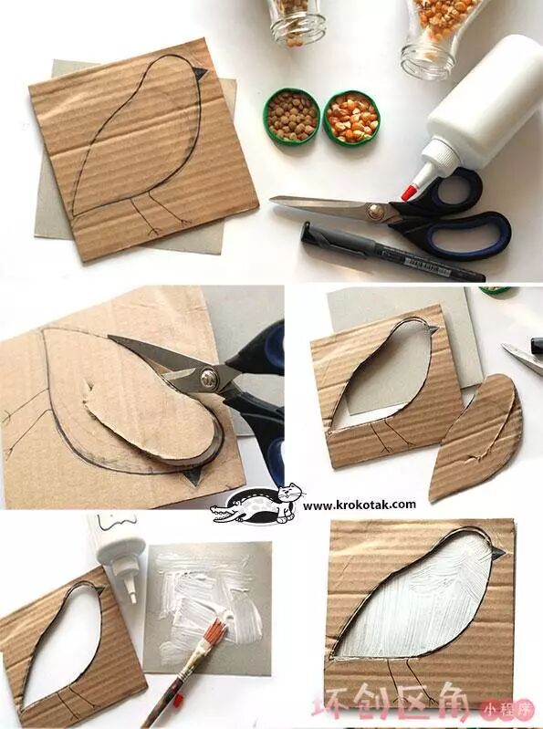 材料:硬纸壳,剪刀,胶水,玉米或其他谷物颗粒(不要太大),画笔。