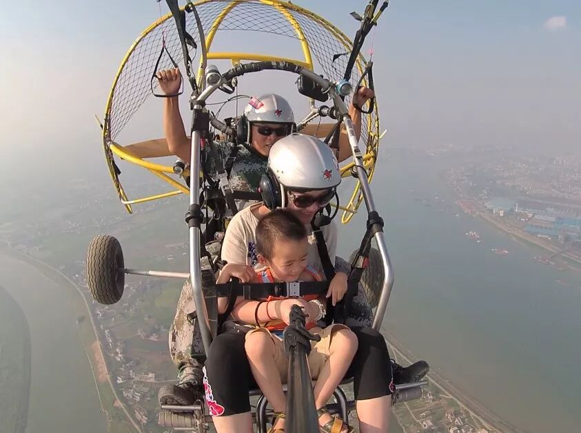 我生性比较野,喜欢尝试新事物,再加上生的两个都是儿子(生不出女儿是我永远的痛),带着他们自然玩得更野了。向往蓝天飞翔,那就把娃绑在身上,一起来个800米高空滑翔伞。我曾经多次带他们去飞滑翔伞,三岁的娃还得和我绑在一起飞,六岁时就可以单独和教练飞了。全程自己拿着自拍杆,笑得合不拢嘴。