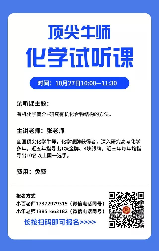 为了解决大家对化学的焦虑和困惑,我们将于本周日推出免费化学试听课!欢迎家长们同学们试听,让我们携手共克化学难关,赢战化学!