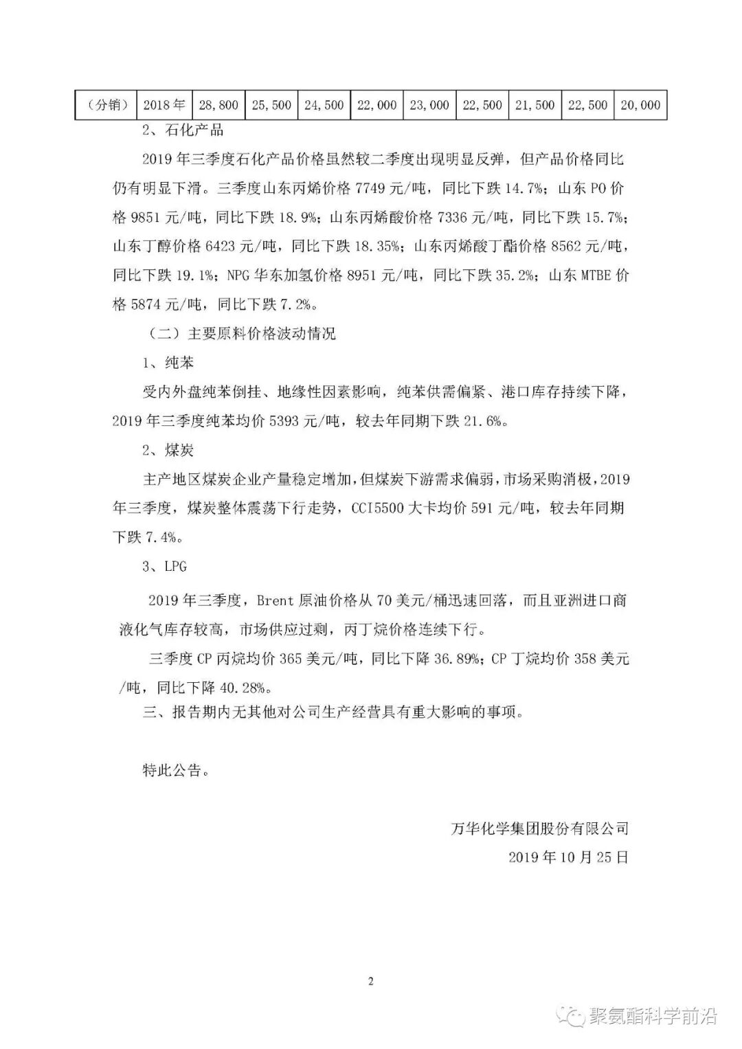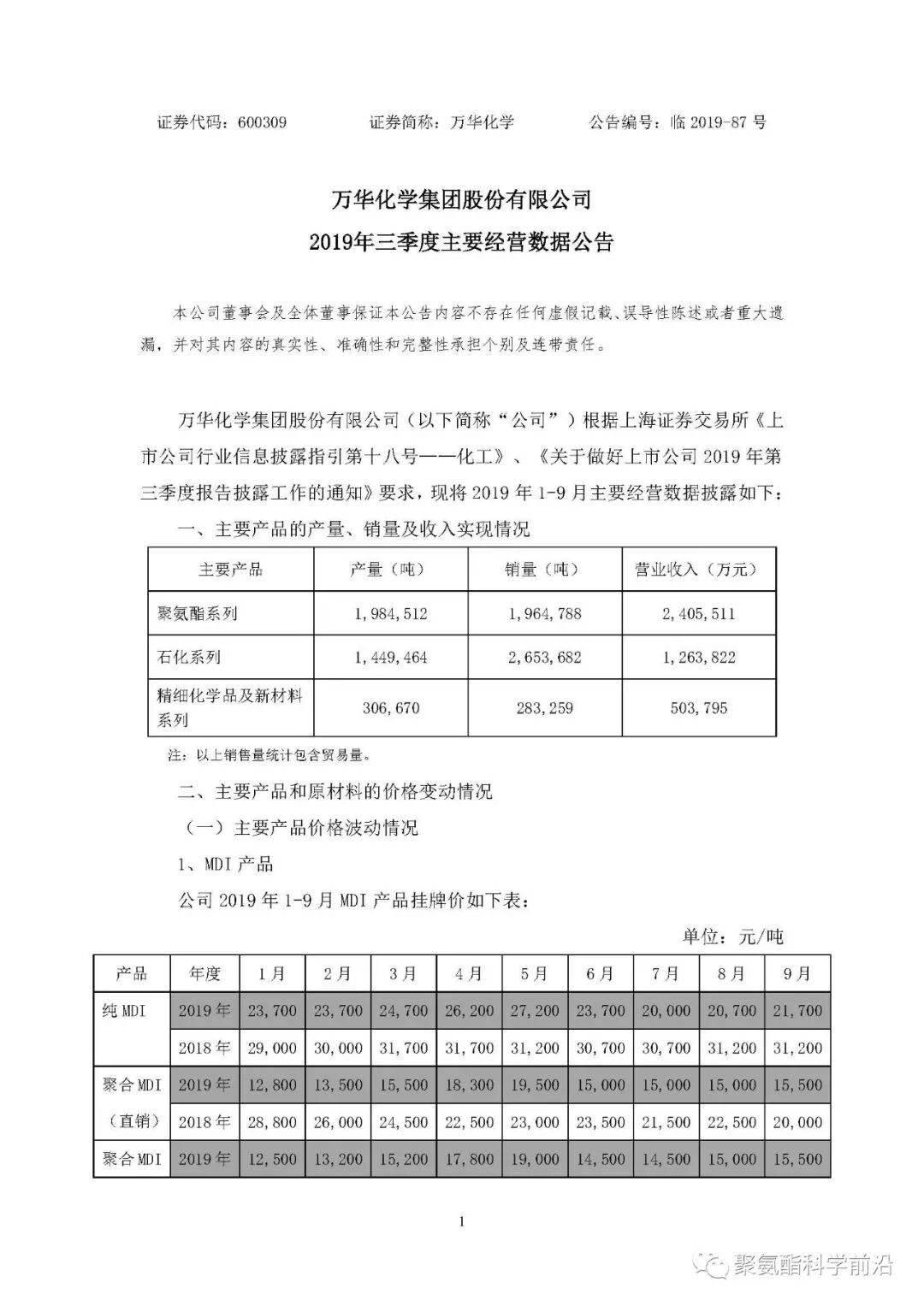 【企业新闻】万华化学2019年三季度主要经营数据公告