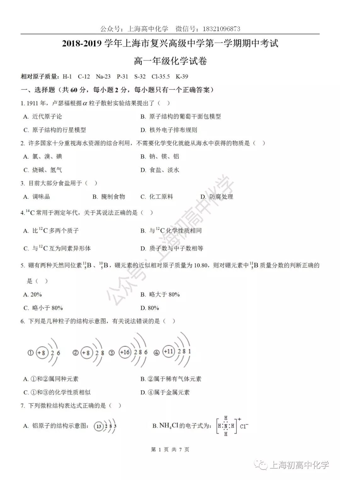 2018-2019学年上海市复兴高级中学高一上化学期中试卷
