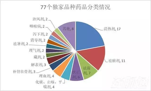药品分类的情况看,品种数最多的是清热剂,有17个品种;祛瘀剂有11个品种,祛湿剂有7个品种,扶正剂有6个品种,其他品种数量如下图: