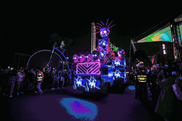 在蓝紫霓虹的重叠下,荧光闪烁飞舞,上演“地狱空荡荡,魔鬼全在晃”的巡游狂欢。