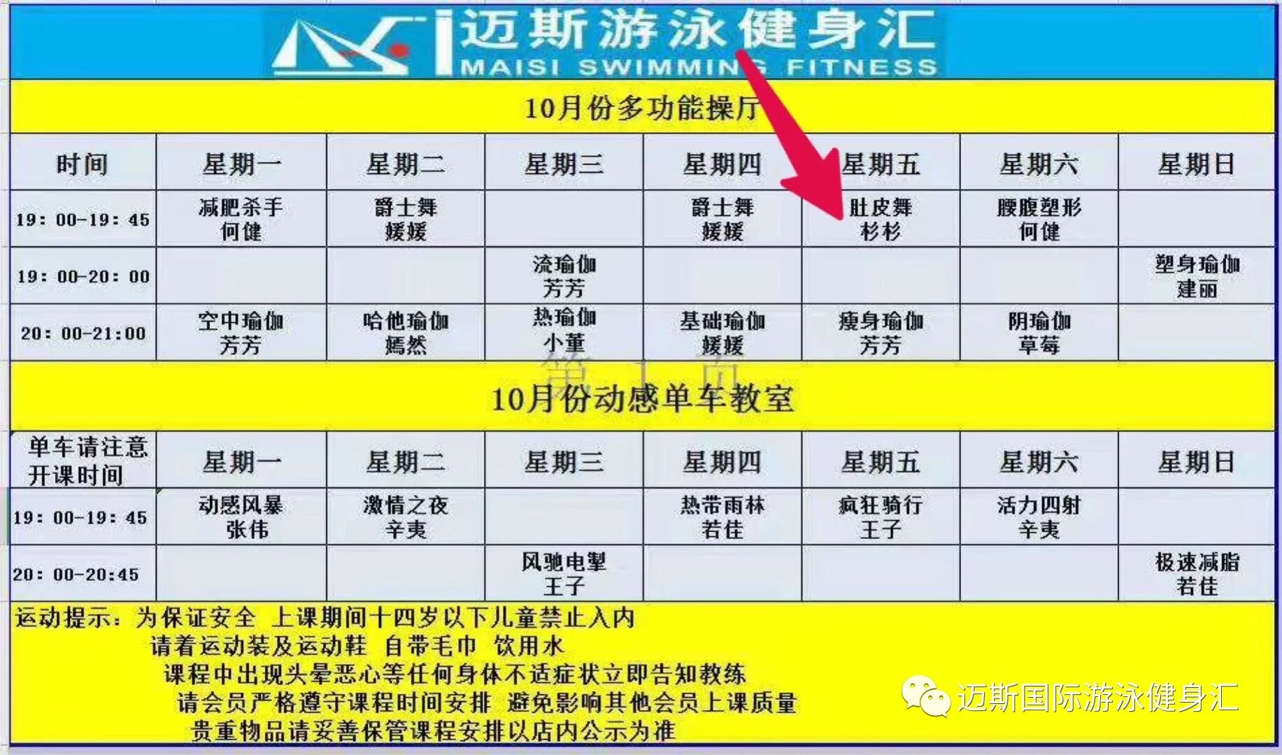 尊敬的会员朋友们: 因杉杉老师今天晚上去参加演出故不能正常排课,改为何建老师的减脂腰腹课程,给您带来不便敬请谅解,祝您生活愉快!迈斯国际游泳健身汇