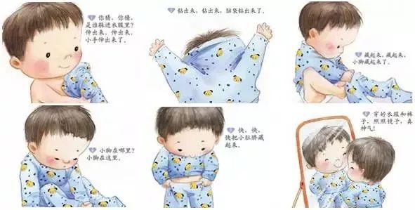 在引导穿衣的时候,可以用歌谣引发孩子穿衣的兴趣。比如,在穿T恤时,可以边穿边唱:“一件套衫四个洞,宝宝钻进大洞洞, 脑袋钻出中洞洞,小手伸出小洞洞。”方便指导,也方便孩子记忆步骤。