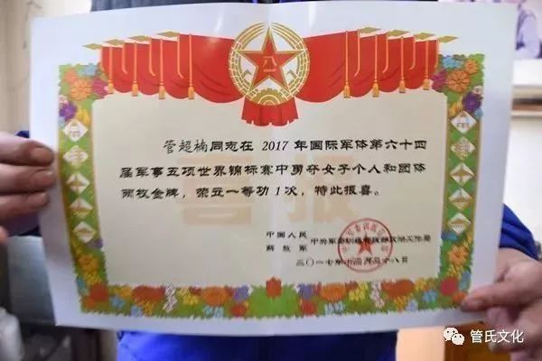 热烈祝贺管超楠军运会获得军事五项个人全能女子(投弹)第一名,这是国家的光荣,军队的光荣,更是管氏的光荣!感谢河南濮阳管氏,为我们带来新的喜悦。