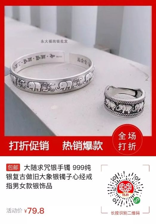? 大随求咒银手镯 999纯银复古做旧大象银镯子心经戒指男女款银饰品