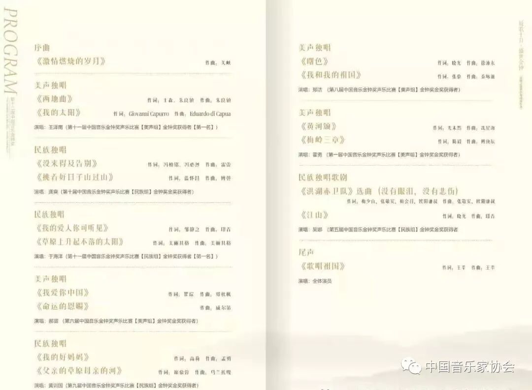 作为一曲耳熟能详的《激情燃烧的岁月》序曲拉开了整场音乐会的序幕。第十一届中国音乐金钟奖声乐比赛美声组金奖获得者王泽南率先登台,为大家带来《两地曲》《我的太阳》两首耳熟能详的作品。接下来,第十届中国音乐金钟奖声乐比赛民族组金奖获得者龚爽赢演唱的《没来得及告别》《挑着好日子山过山》;第十一届中国音乐金钟奖声乐比赛民族组金奖获得者于海洋演唱的《草原上升起不落的太阳》;第六届中国音乐金钟奖声乐比赛美声组金奖获得者郝苗演唱的《我爱你中国》《命运的恩赐》;第九届中国音乐金钟奖声乐比赛民族组金奖获得者黄训国带来的《我的好妈妈》《父亲的草原母亲的河》;第八届中国音乐金钟奖声乐比赛美声组金奖获得者郑洁演唱的《曙色》《我和我的祖国》;第五届中国音乐金钟奖声乐比赛金奖获得者吴娜献唱的《洪湖赤卫队》选曲和《江山》,以及成都籍歌唱家、第一届中国音乐金钟奖声乐比赛金奖获得者霍勇演唱的《黄河颂》《梅岭三章》等精彩节目轮番呈现,展现了金钟奖得主们的演唱功底和艺术水准,赢得现场观众阵阵热烈掌声。演出在所有艺术家登台合唱的《歌唱祖国》雄浑嘹亮的歌声中圆满结束。