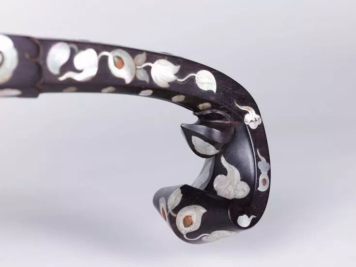 然后呢,还要在其表面挖出浅浅的凹槽,以螺贝为原料,制作出片状的花鸟、云纹、宝相花等等纹样,嵌入木材表面,厚螺钿装饰几乎覆盖了整个琵琶。