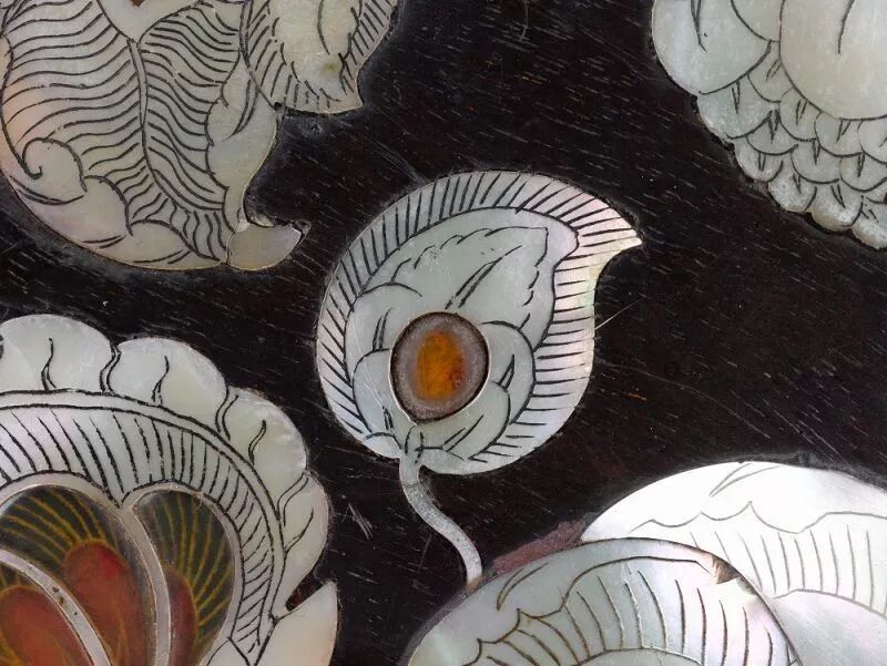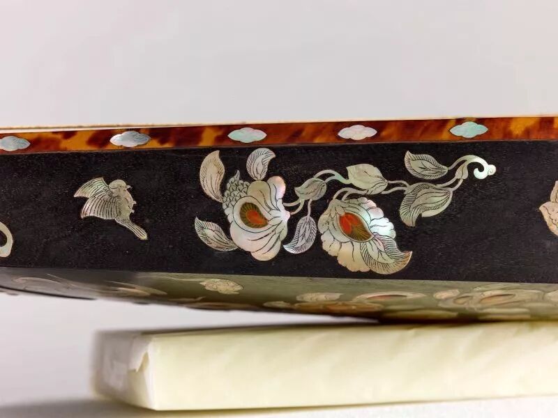 别急,看到这里还没完工,花叶形螺钿的中心处,用红色、绿色的彩,描出更细致的花形纹样,并以金线描边;又在花纹表面覆盖一层琥珀或玳瑁所制成的半透明薄片,使花纹呈现出若隐若现的灵动之感,乐器表面也呈现凹凸的质感。