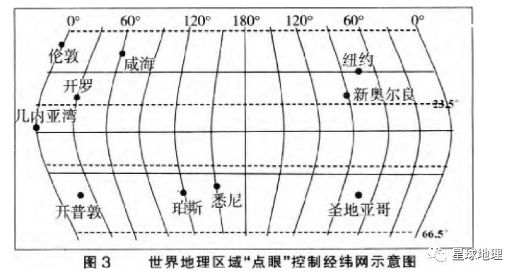 三、“脑中地图” (Mental Map) 的应用“脑中地图” (Mental Map) 就是按照地理事物的空间结构, 加以适当整理和概括, 在头脑中编制的一幅“地图”, 以有效地储存和记忆各种自然环境和人文地理信息。它能有效地训练学生从读图、用图、绘图到进行无图思考, 发展学生的空间想象及形象思维能力。“脑中地图”的概念首先出现在美国《国家地理标准》的“从空间观察世界” (the world in spatial terms) 这部分教学内容中, 并被确定为“空间认识”的三项标准之一, 总体要求是让学生懂得如何使用脑中地图来组织有关人类、地区、环境的信息。“脑中地图”的构建方法主要有两种。一种是熟悉几条主要经纬线穿越的行政区、地形区、气候区、自然带、土壤带、农业区。如赤道穿过非洲中部、东南亚、南美洲北部;主要的地理事物有刚果盆地、东非高原、马来群岛、亚马孙平原等;主要的气候类型为热带雨林气候、热带草原气候;主要的自然带为热带雨林带、热带草原带等。另一种方法是通过分析、记忆几个有限的“点眼”, 进而控制经纬网的格局 (如图3) , 并通过对几个“点眼”的自然环境特征和人文环境特征的记忆从而掌握一个个小区域的地理环境特征, 最后逐渐连片, 达到对整个世界地理格局的掌握。这样, 当一个地区出现时, 关于该地区的自然环境特征和人文环境特征就会源源不断地涌现出来。
